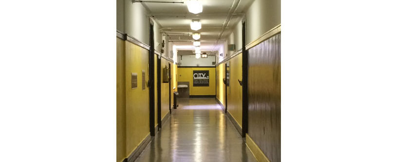 BGE adds an unmistakable sign to the end of a long hallway at City Polytechnic High School.