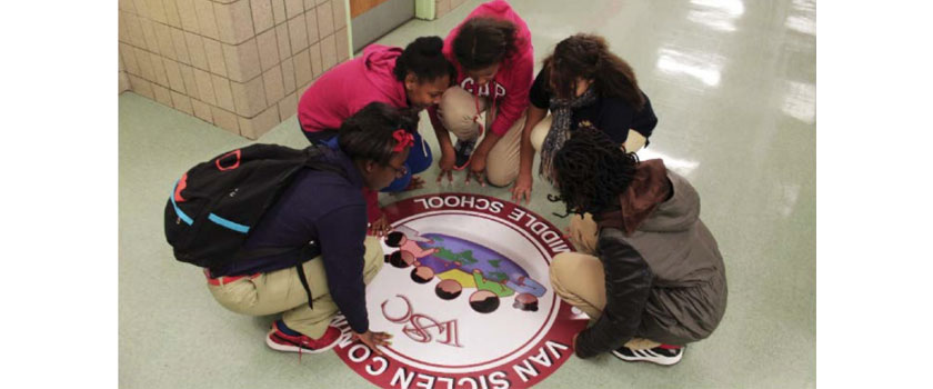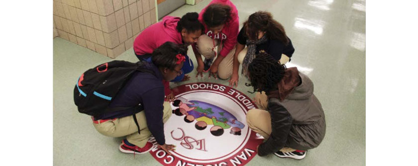 Students from Van Siclen admiring the attractive floor decal put in place by BGE.