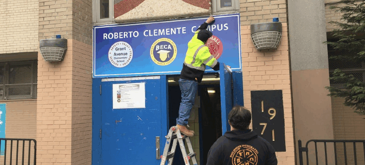 Installation of sign being added to the main entrance at Roberto Clemente Campus creating an identity for three schools.